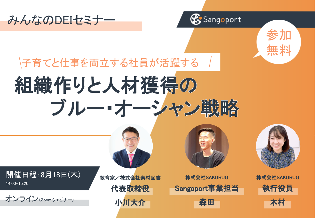 DEIを推進する採用マッチングプラットフォーム『Sangoport(サンゴポート)』がおくる『みんなのDEIセミナー』シリーズ 教育家の小川氏と一緒に考える、子育て中社員の人材戦略と企業のサポート