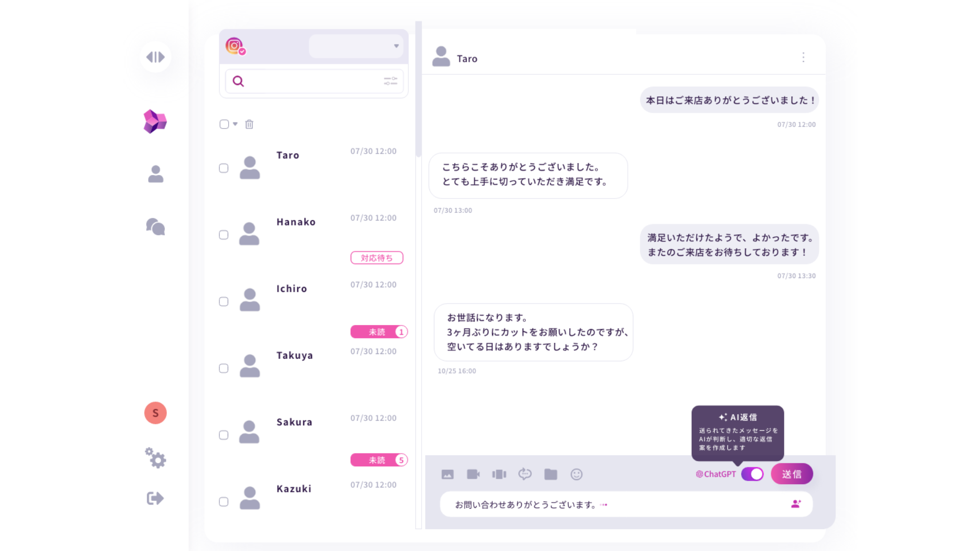 今回のChatGPTを活用したGenerative AI(ジェネレーティブAI)がメッセージ返信案を作成する新機能によって、ユーザーごとにパーソナライズされた最適なメッセージ返信が可能になります。今までの会話の内容をChatGPTが読み取り、メッセージの返信案を作成し、Instagram運用担当者の工数を削減いたします。また、ChatGPTが迅速かつ正確に返信案を生成することにより、ユーザーはスムーズかつ迅速なサポートを受けることができます。これにより、ユーザー体験が向上し、顧客満足度が高まることが期待されます。