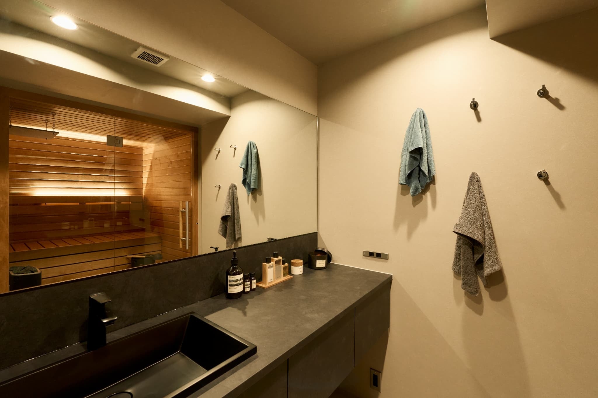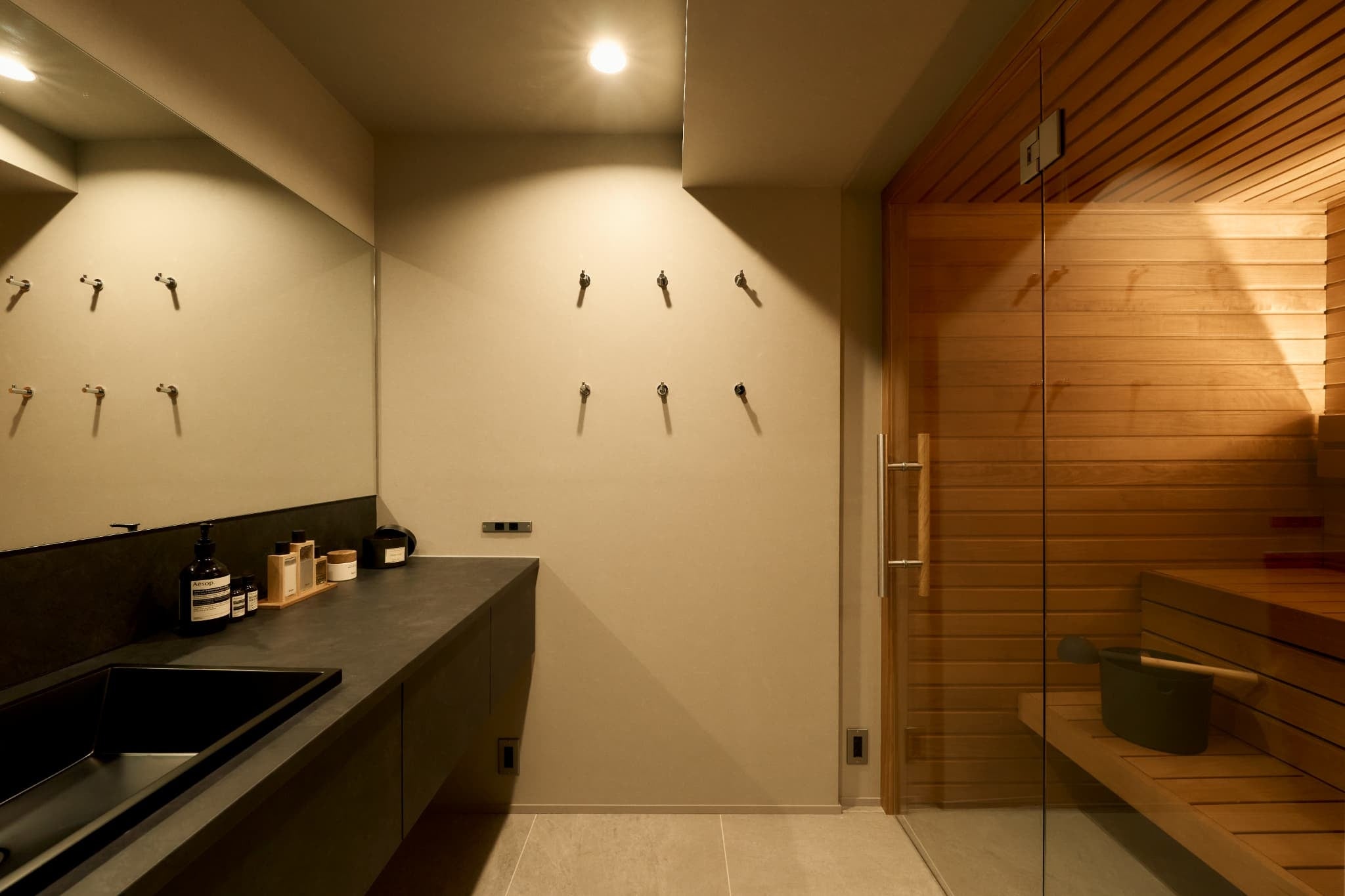 サウナが設置されたのは洗面所や浴室が集まるサニタリーゾーン内。サウナ好きの同氏のこだわりが詰まった設計となっており、導線や内装にも様々な『仕掛け』が施されています。