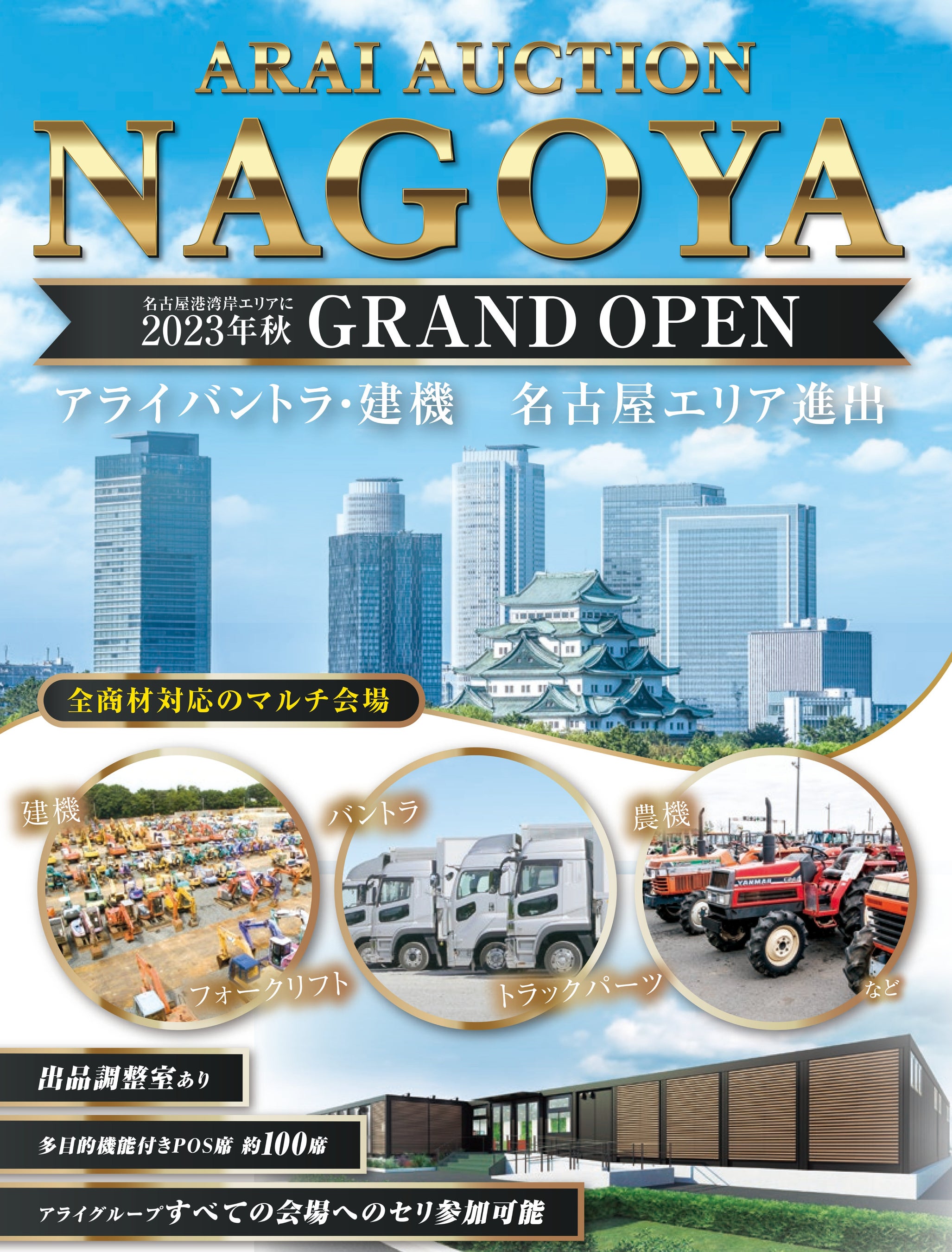 アライオークションは、昨年より全会場で全商材の取り扱いに向けて、ベイサイド会場を始めとして仙台会場、福岡会場で複数商材取り扱いを進めて参りました。今回オープンする名古屋会場は、初の中部エリアの会場としてトラック、総合機械(建設機械・農業機械・フォークリフト)を取り扱うマルチ会場となります。