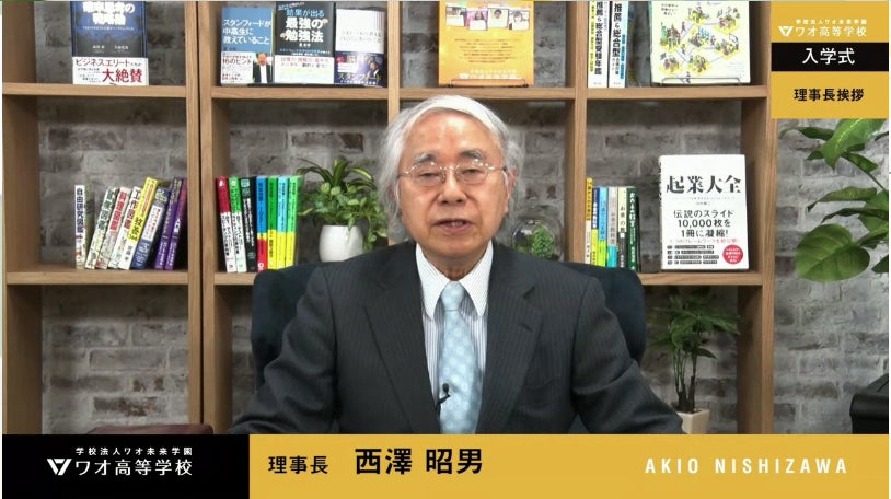 45年以上に渡り教育に貢献し、ワオ未来学園の創始者である理事長の西澤昭男より、新入生に向けてお祝いのメッセージを届けました。いま、教育界で起きている大きな流れ「教育から学育へ」をもとに、自分で学び自分で育つ「学育」の重要性について説明。ワオ高校では、哲学・科学・経済というテーマを通して、学ぶ姿勢、生きていくための姿勢を学んで欲しいと熱く語りました。そして、大きく成長する人の特徴として ①素直 ②思いやり ③責任感 ④覚悟 の4つをバランス良く持っていることが大切であり、自身が映画監督として制作をしているアニメーションの主人公が成長していく過程でもこれらを取り入れているという話を紹介しました。ワオ高校の理念が、わかりやすいエピソードと思いのこもった言葉で届けられました。