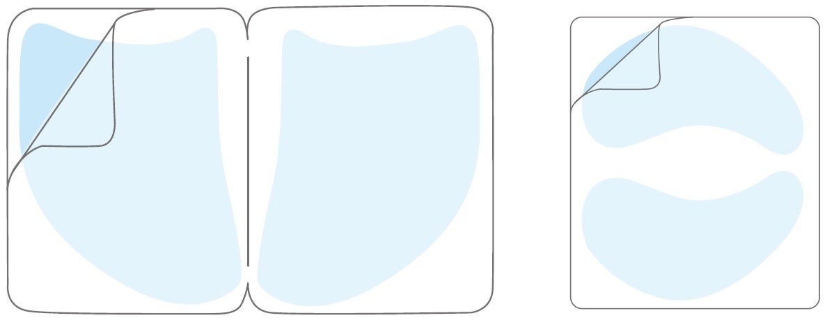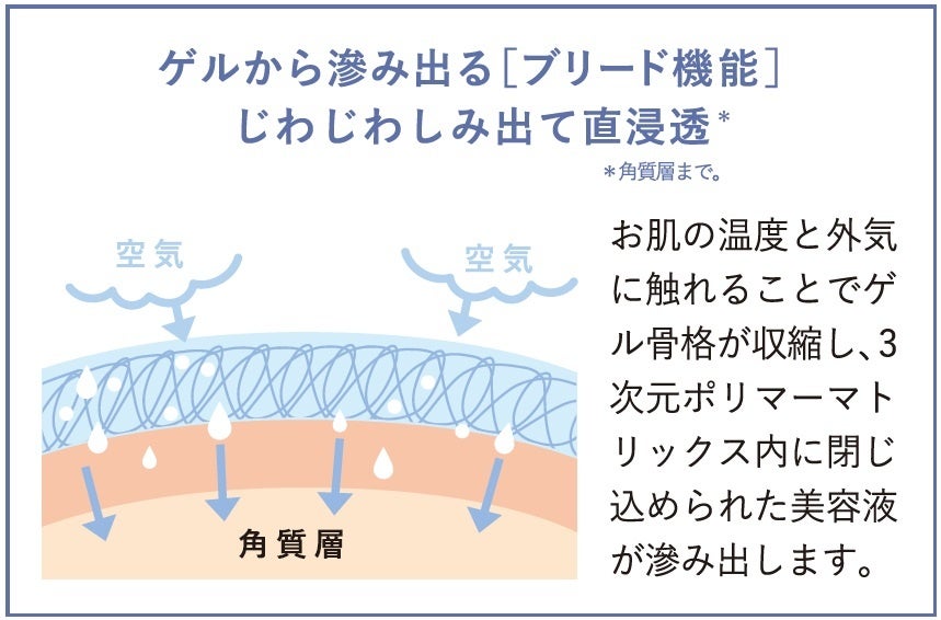 お肌の温度と外気に触れることでゲル骨格が収縮して、閉じ込められていた美容液が滲み出る[ブリード機能](図②)が最大の特長です。ピタッと肌に吸い付いて肌に密着直浸透* 。貼っている間中(20~40分)ゲルから美容液成分がじわじわ滲み出て、肌にうるおいをたっぷり浸透*させます。*角質層まで