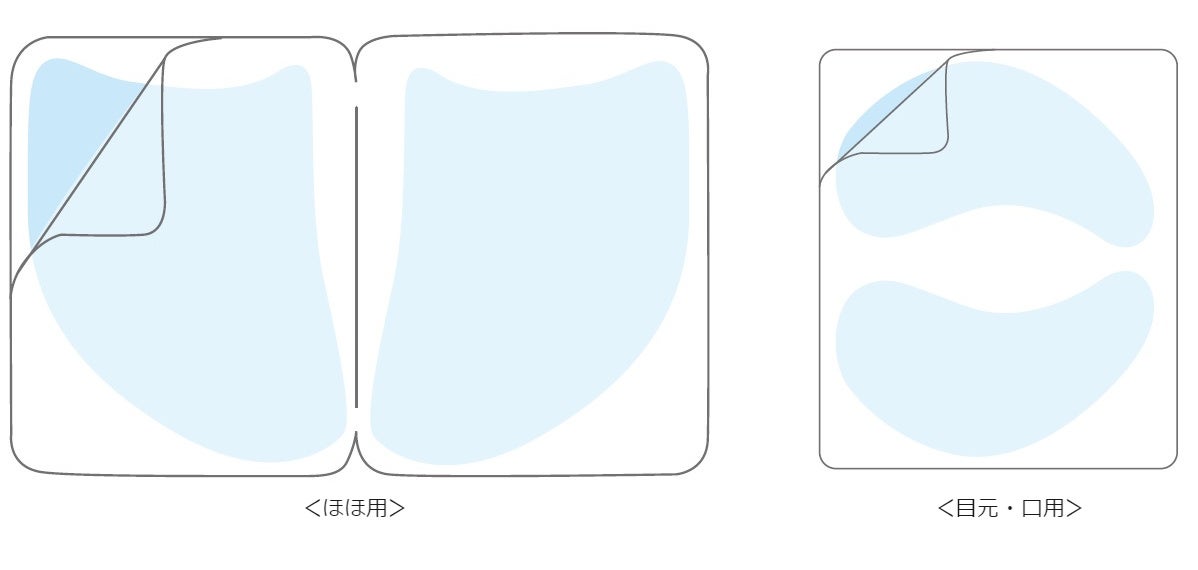 洗顔後、化粧水でお肌を整えます。半透明の保護シートをはがしゲルを取り出し、保護シート側の面を顔側に貼ります。週1~2回、ほほ用は1回30~40分、目元・口元用は1回20~30分を目安にご使用ください。
