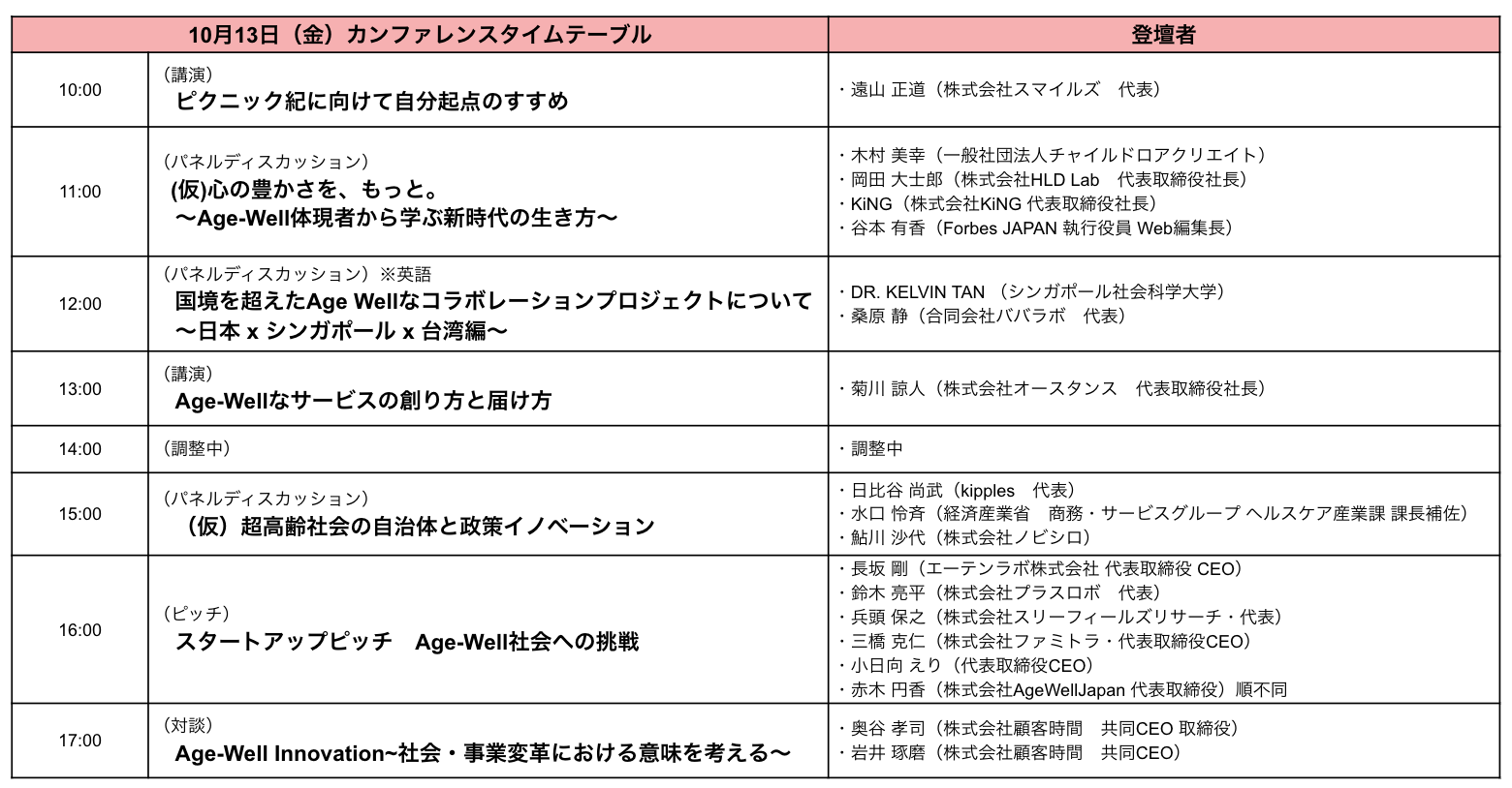 11:00 | (パネルディスカッション) (仮)心の豊かさを、もっと。 〜Age-Well体現者から 学ぶ新時代の生き方〜 | 谷本有香(Forbes JAPAN 執行役員 Web編集長) 木村美幸(一般社団法人チャイルドロアクリエイト) 岡田大士郎(株式会社HLD Lab 代表取締役社長) KiNG(株式会社KiNG 代表取締役社長) |