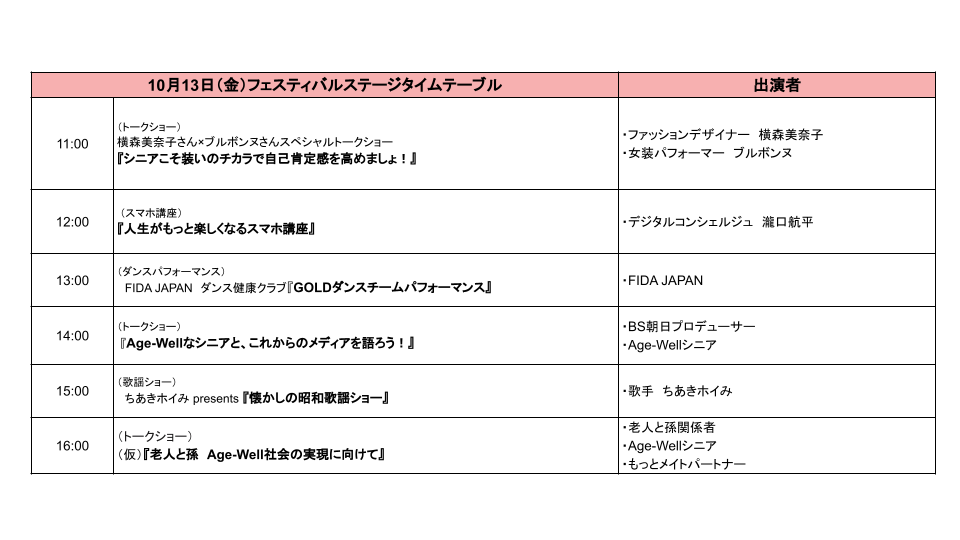 16:00 | (コラボ企画) 老人と孫 × AgeWellJapanスペシャルコラボ | 老人と孫関係者 Age-Wellシニア もっとメイトパートナー |