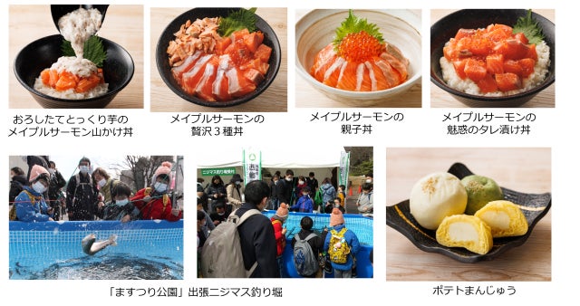 福島県の玄関口に位置し、豊かな自然に恵まれ、首都圏からのアクセスも抜群の福島県西郷村が昨年に続き、今年も出店します。西郷村は、日本の〝村〟では唯一、新幹線の駅があり、魅力的な観光スポットやおいしいグルメも盛りだくさんです。村の特産品である阿武隈川の清流で丹精込めて育てられた「メイプルサーモン」の海鮮丼は昨年、連日完売の大人気でした。今年は新メニューも加え、販売食数を大幅に増やします。新メニューは、特産品の「とっくり芋」をお客さんの目の前ですりおろし、たっぷりとかける「おろしたてとっくり芋のメイプルサーモン山かけ丼」。昨年、満員御礼の大好評だった村の観光名所である「ますつり公園」の出張ニジマス釣り堀を今年も設けます。マルシェブースでは、村の名物グルメ「ポテトまんじゅう」を、ホカホカでお召し上がりいただけます。