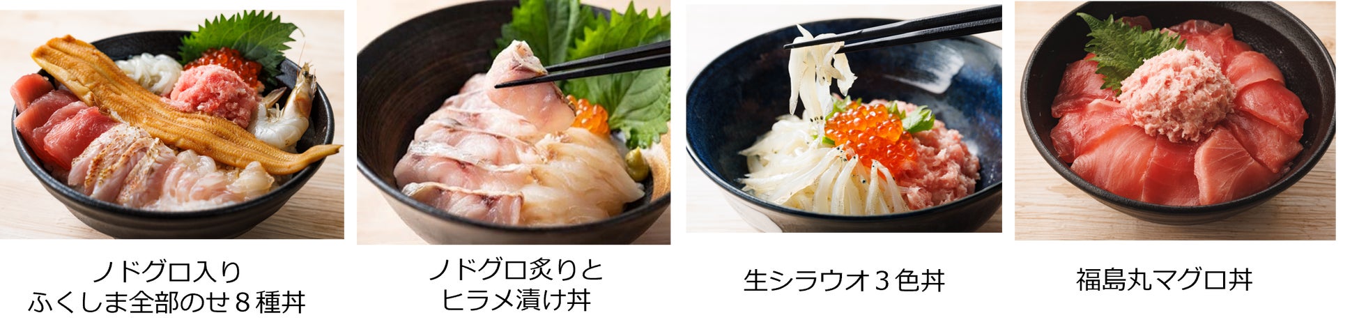 「かに船・ふくしま海鮮丼ブース」の目玉メニューが、「常磐もの」と呼ばれる福島の魚介を贅沢に盛った極上の「ノドグロ入りふくしま全部のせ8種丼」です。今回は、白身のトロと呼ばれるノドグロの炙り、「常磐もの」の代表格のヒラメの漬け、葛尾村で陸上養殖された生エビ、この時期にしか味わえない生シラウオ、脂ののったアナゴ、小名浜海星高校の生徒が練習船「福島丸」で漁獲したマグロの切り落としとネギトロに、イクラも添えて、過去最多の8種をてんこ盛りにしました。お好みの魚介を味わえる「ノドグロ炙りとヒラメ漬け丼」「生シラウオ3色丼」「福島丸マグロ丼」もご用意。「常磐もの」を食べ尽くそう!
