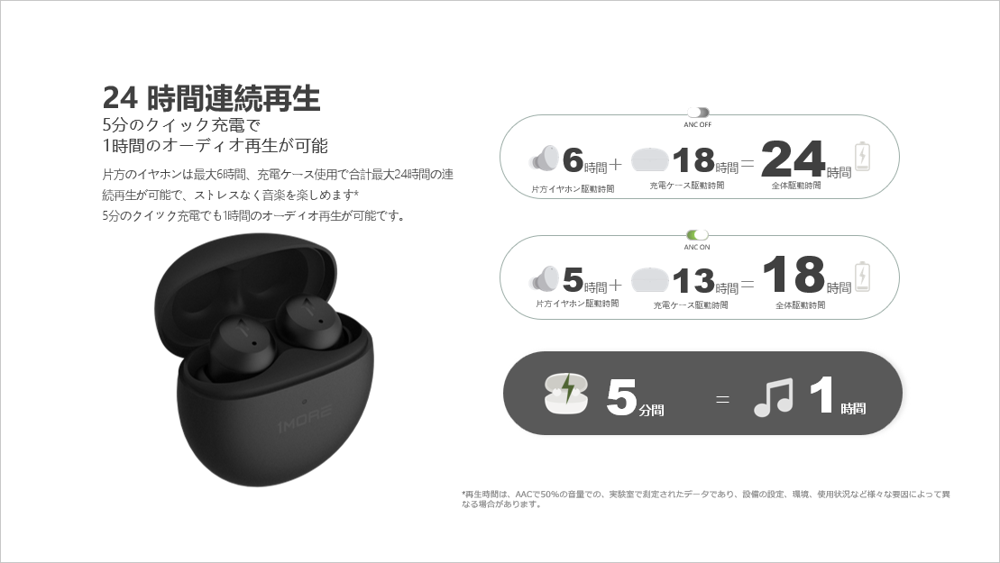 質の高い睡眠をとることが重視される昨今の日本において、ストリーミングサイト・動画再生サイトにて焚火や川の流れる音といった安らぎある癒しの音楽を聴きながら寝落ちすることがになりつつあります。ところが一般的なイヤホンは睡眠に特化しているわけではない為、寝返りの時に不快に感じるときがあるかもしれません。Comfo Buds Miniは"寝ホン" という通称がある通り睡眠時に使えるように小さなデザインに仕上げました。寝返りの際に邪魔にならず電源オフも静かなので朝までぐっすりな状況を崩しません。