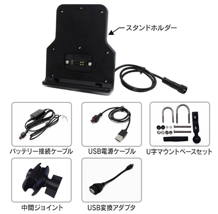 スタンドホルダー、中間ジョイント、U字マウントベース、バッテリー接続ケーブル、USB電源ケーブル
