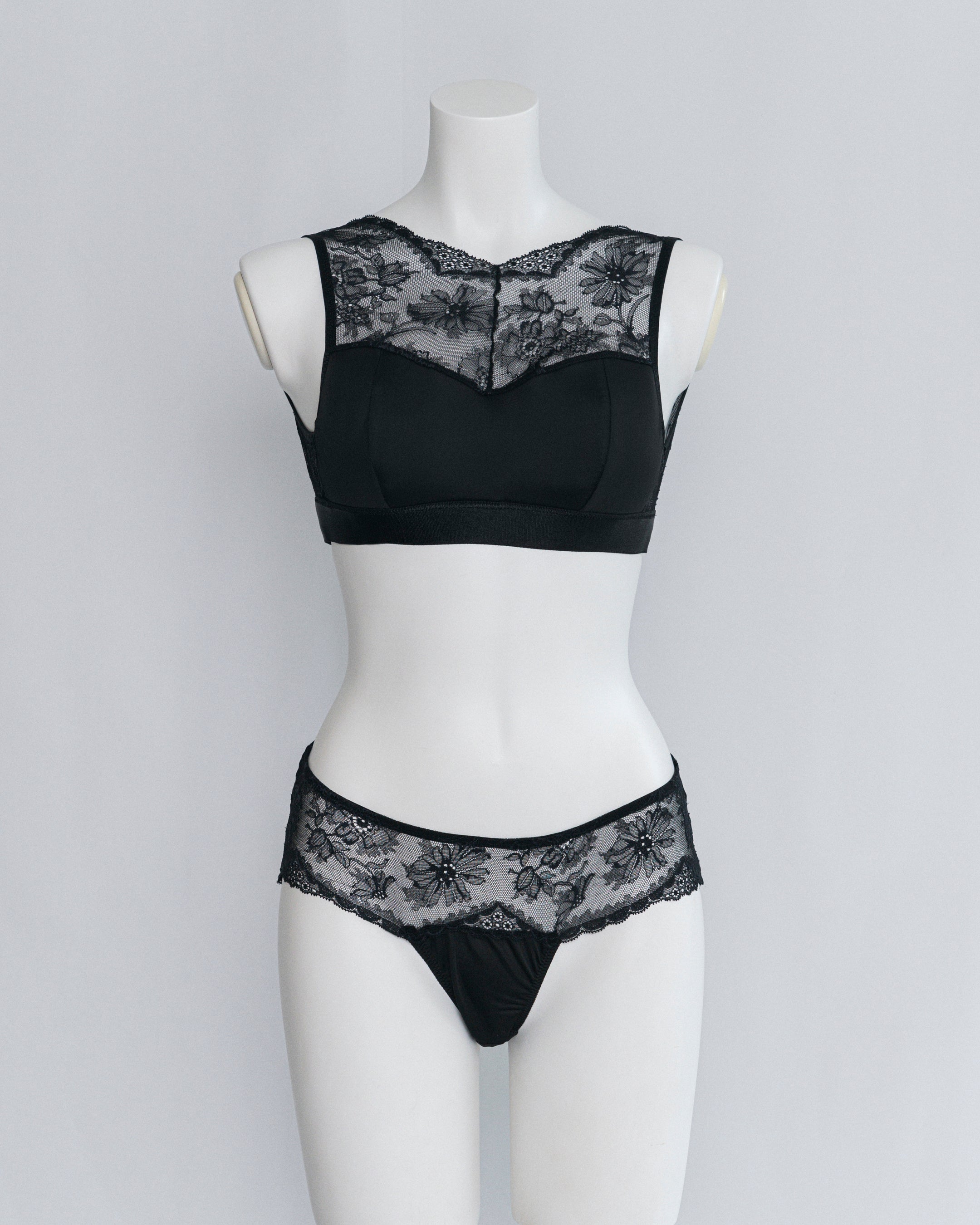 商品ラインアップはブラトップ、ショーツ2種(フルバックとタンガ)。フランス産の花柄レースの2種類を使用し、身生地には旭化成アドバンスによる地球環境に配慮した新・高機能ファブリック「ECOSENSOR®(エコセンサー®)」を、ブラトップの裏地とショーツのクロッチ部分には、繊維を中心に扱うライフスタイル提案商社豊島のオーガニックコットン「ORGABITS(オーガビッツ)」を採用しています。ブラトップ、ショーツ共に日本国内の職人の手で一つひとつ作られた高品質のメード・イン・ジャパン。デザインは、日本発のランジェリーブランド「アルバージェ ランジェリー」が担当しました。