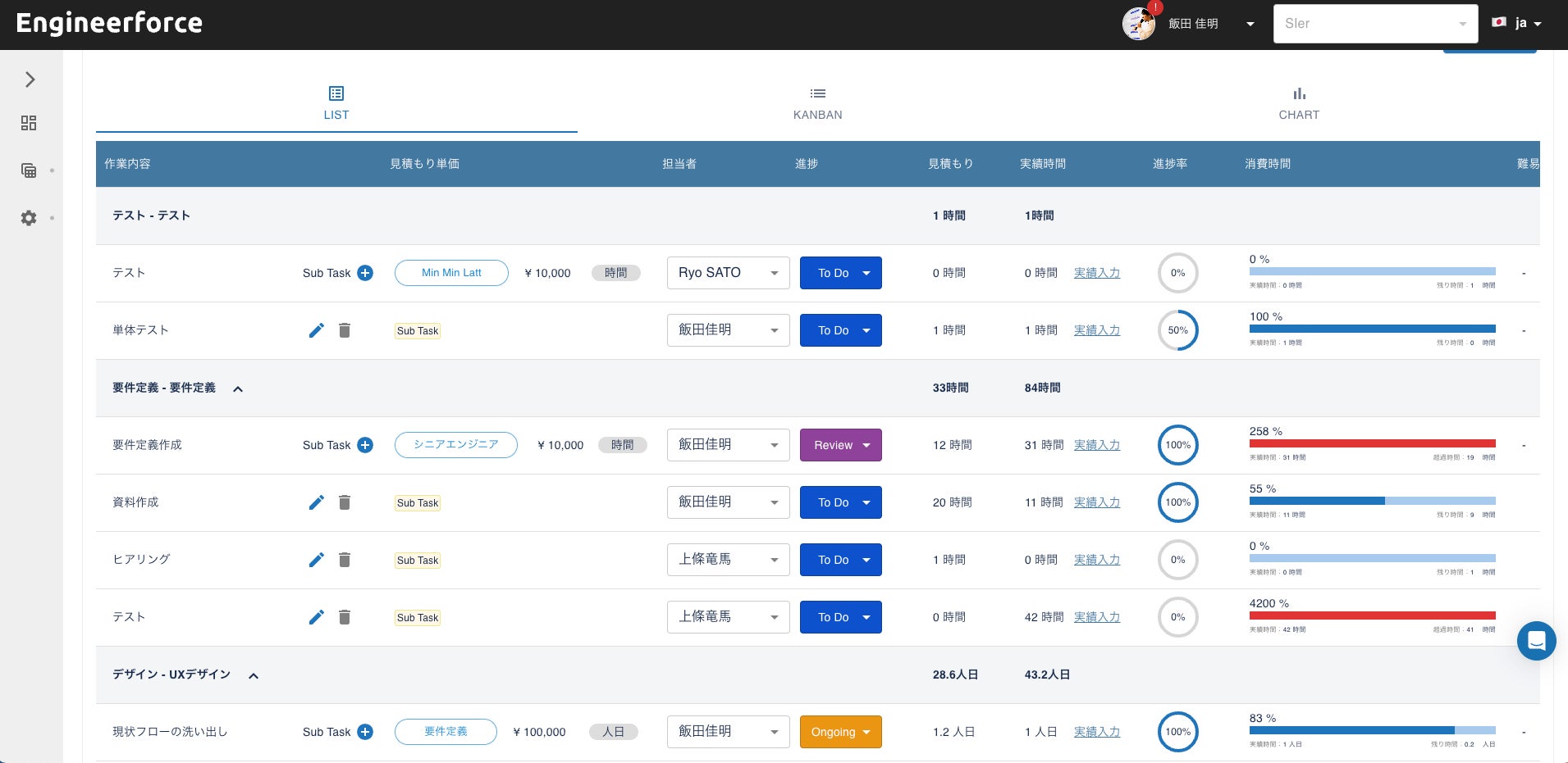 見積もり作成後、プロジェクトの進捗管理、見積もりとの差分を確認することができます。