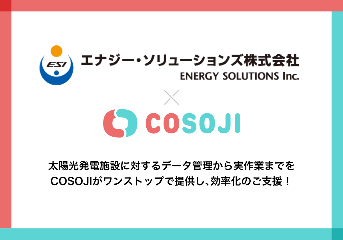 太陽光発電所を含む不動産管理業務における、受発注を含む工程管理から作業員手配までワンストップで行えるサービス「COSOJI(こそーじ)」を展開するRsmile株式会社(本社:東京都中央区、代表取締役:富治林 希宇)は、再生可能エネルギーに関するシステム開発や管理サービスの提供を行うエナジー・ソリューションズ株式会社(本社:東京都千代田区、代表取締役:森上 寿生)にCOSOJIを本格導入致しました。COSOJIは、太陽光発電所を含む不動産の管理業務における受発注や工程管理の仕組み及びデータ管理に加え、各地域の工務店や作業員への発注までをワンストップで行え、太陽光O&M会社を含む不動産管理会社の管理業務を統合的に支援するサービスです。
