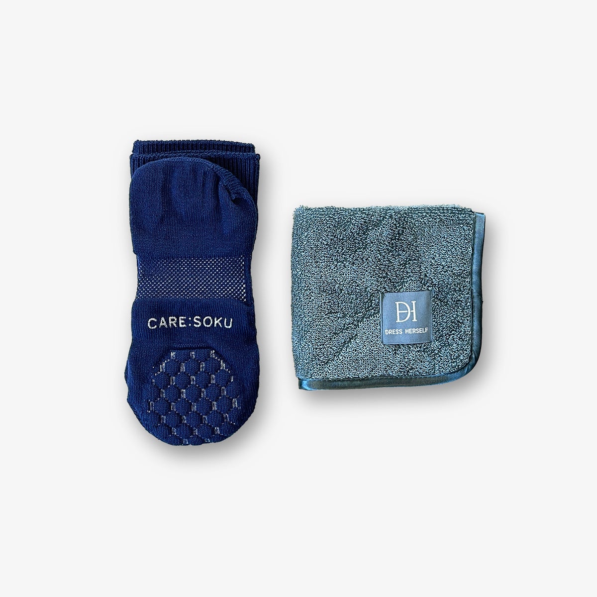 ケアソク〈ととのえる ベーシック〉とDRESS HERSELFの〈ハンドタオル シルク〉の2点セットです。