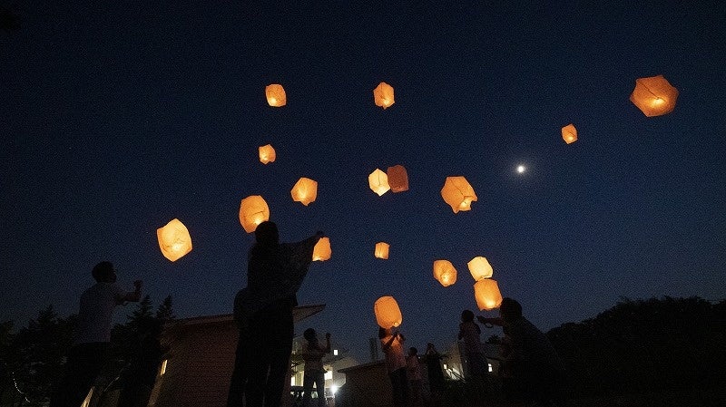 スカイランタン2個付きのプラン。yamagata glamの夏のメインイベント「スカイランタンナイト」に参加し、実際にスカイランタンをあげて幻想的な夜空をお楽しみいただけます。火を使わないランタンなので、お子さまでも安心してランタンをあげることができます。幻想的な世界とともに非日常を体験し、思い出に残るひとときをお過ごしいただけます。