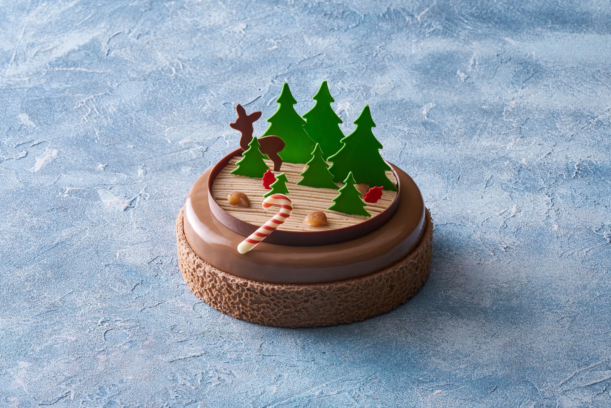 シェフ ステファンの出身国、フランスを代表するケーキのモンブラン。フランス、イタリア、日本の様々な特徴の栗を使用した濃厚なバタークリームとムースに、さくさくのメレンゲで食感にアクセントを加えました。ステファンの故郷であるフランスの森で遊ぶ小鹿を飾った、フランスのクリスマスオーナメントを彷彿させる、ファンタジックでユニークなデコレーションに仕上げました。