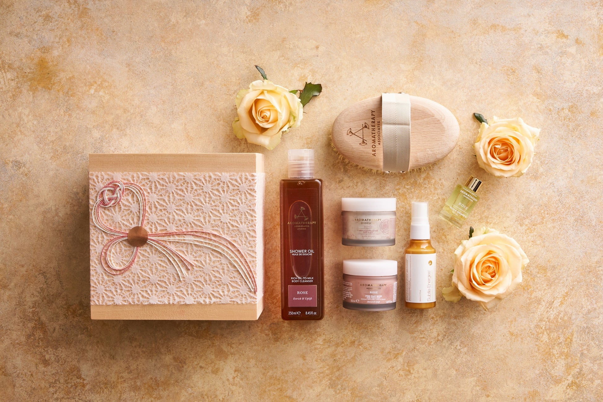 スパプロフェッショナルが厳選するアイテムをヒノキの桝箱に詰め込んだ、7年目を迎える「スパおせち」。「Love & Confident」をコンセプトに、新しい自分になるために必要なスパアイテムをセレクト。アロマセラピーアソシエイツから、滑らかで柔らかく輝きのある肌へと導く「ポリッシングボディブラシ」、髪・顔・体に栄養を与えて気持ちも高める「ローズ ラグジュアリー キット(スクラブ、マスク、バス&シャワーオイル3点セット)」、サトル エナジーズからは、集中力を高めて思考をすっきりとさせる「オーラ プロテクション ミスト」をセットにしました。(販売はスパブティック)