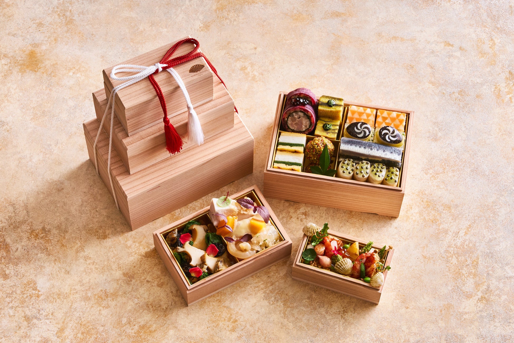 「食の殿堂」と称される当館が誇る、4つのレストランのシェフのスペシャリテや、お正月の特別料理が重箱の中で一堂に会するおせち。8年連続「ミシュランガイド東京」の星に輝く「タパス モラキュラーバー」からは、サンゴ礁に集まる海老や貝を表現した「大地‐カリフラワー・マサラロブスター・タンドリー車海老」を。フレンチファインダイニング「シグネチャー」からは、長寿の象徴の手長海老を使用した一品「ラングスティーヌ ベルビュー」を含む4品、広東料理「センス」からは、新年の挨拶言葉にも使用される髪菜(ファッチョイ)を使用し、縁起を担いだ一品「国産活鮑のオイスターソース煮込み 髪菜と豆苗添え」を含む4品、イタリアンダイニング「ケシキ」からは、イタリアの伝統正月料理をアレンジした「カピトーネのロースト サフランソースと黒にんにく」を含む4品を、三段のお重に詰めてご用意いたしました。