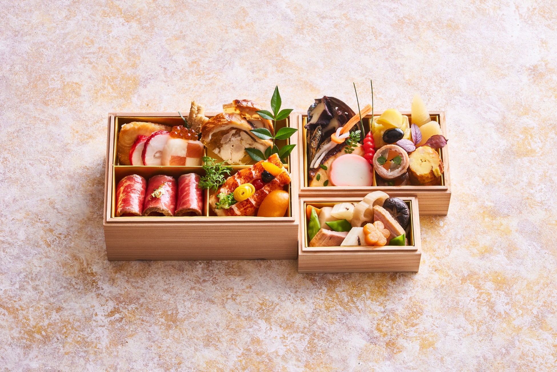 毎年人気の、お一人さまからお愉しみいただける三段重箱入りの和洋折衷のおせち。「オマール海老 金柑のヴィネグレット」、「鮑の赤ワイン蒸し」、「国産牛サーロインのロースト」など新年の門出に相応しい高級食材を使用したメニューのほか、伝統的なおせち料理に欠かせない縁起物に洋のニュアンスを取り入れた「ラズベリービネガーで漬けた酢蛸」、当館オリジナルブレンドティーのエッセンスを加えたジュレにしょっつるを合わせて和風に仕上げた「パテアンクルート」、また「柑橘風味栗のタルト 黒豆添え」など、多彩で豊かな味わいを取り揃えました。