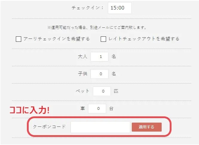 予約フォームのクーポンコード欄に、【直前割1】と入力します。