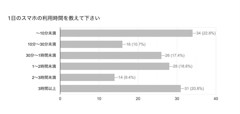 実際に下作延小学5、6年生の生徒149名にSNSに関するアンケートを実施しました。「スマートフォンを持っていますか」という質問では、112名(75.2%)の生徒がスマートフォンを持っているという結果になりました。1日のスマホ利用時間では、「10分未満」と回答した生徒が34名と一番多い一方で、2番目に多い回答としては「3時間以上」と生徒によってスマートフォンの利用時間に差が見られました。