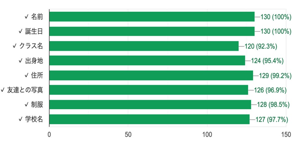 「オンライン上で知らない人とやり取りをしたことがありますか」という質問では、「やり取りをしたことがある」と回答した生徒が47名(32.4%)となりました。知らない人とオンライン上でコミュニケーションを取る機会としては、「オンラインゲームでの通信」や「チャットグループへの加入」が挙げられました。また、「SNS上でトラブルに巻き込まれたことがありますか」という質問では、99.3%の生徒が「トラブル巻き込まれたことはない」と回答した一方で、「トラブルに巻き込まれた際の対応策を知っていますか」という質問では「対応策を知らない」と回答した生徒が過半数以上(57%)という結果となりました。これより実際の被害にはまだ遭遇してないが、対応策を知らないことからITリテラシーを高める必要性があることも分かりました。