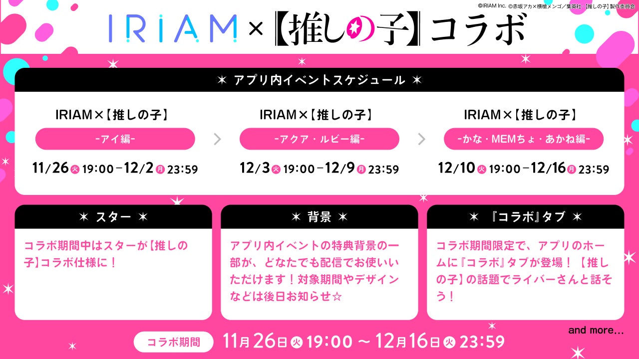 「IRIAM Anniversary Project ミライト」の企画の一つとして、2024年11月26日(火)19:00から12月16日(月)23:59まで【推しの子】のキャラクターたちが登場するアプリ内コラボイベント「IRIAM×【推しの子】」を開催します。本コラボでは、「アイ」、「アクア」&「ルビー」、「有馬かな」&「MEMちょ」&「黒川あかね」がテーマのイベントを週替りで開催するほか、全ユーザーが配信で使用できる背景や、無償でライバーを応援できるスターもコラボ仕様で登場予定です。イベント詳細などは、『IRIAM』アプリ内及び『IRIAM』公式Xにて公開しています。