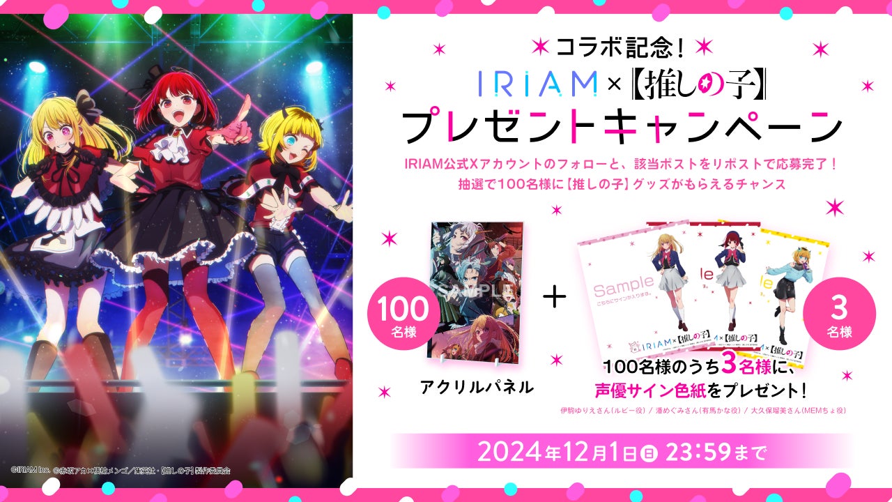IRIAMと【推しの子】のコラボ開催を記念して、プレゼントキャペーンを開催しています。本キャンペーンでは、『IRIAM』の公式Xの対象ポストをリポストすることで、【推しの子】のアクリルパネルが100名様に当たります。さらにWチャンスで、【推しの子】の声優である伊駒ゆりえさん(ルビー役)、潘めぐみさん(有馬かな役)、大久保瑠美さん(MEMちょ役)のサイン色紙が各1名、合計3名様に当たります。本キャンペーンの詳細は公式Xのキャンペーン対象ポストにて公開しています。