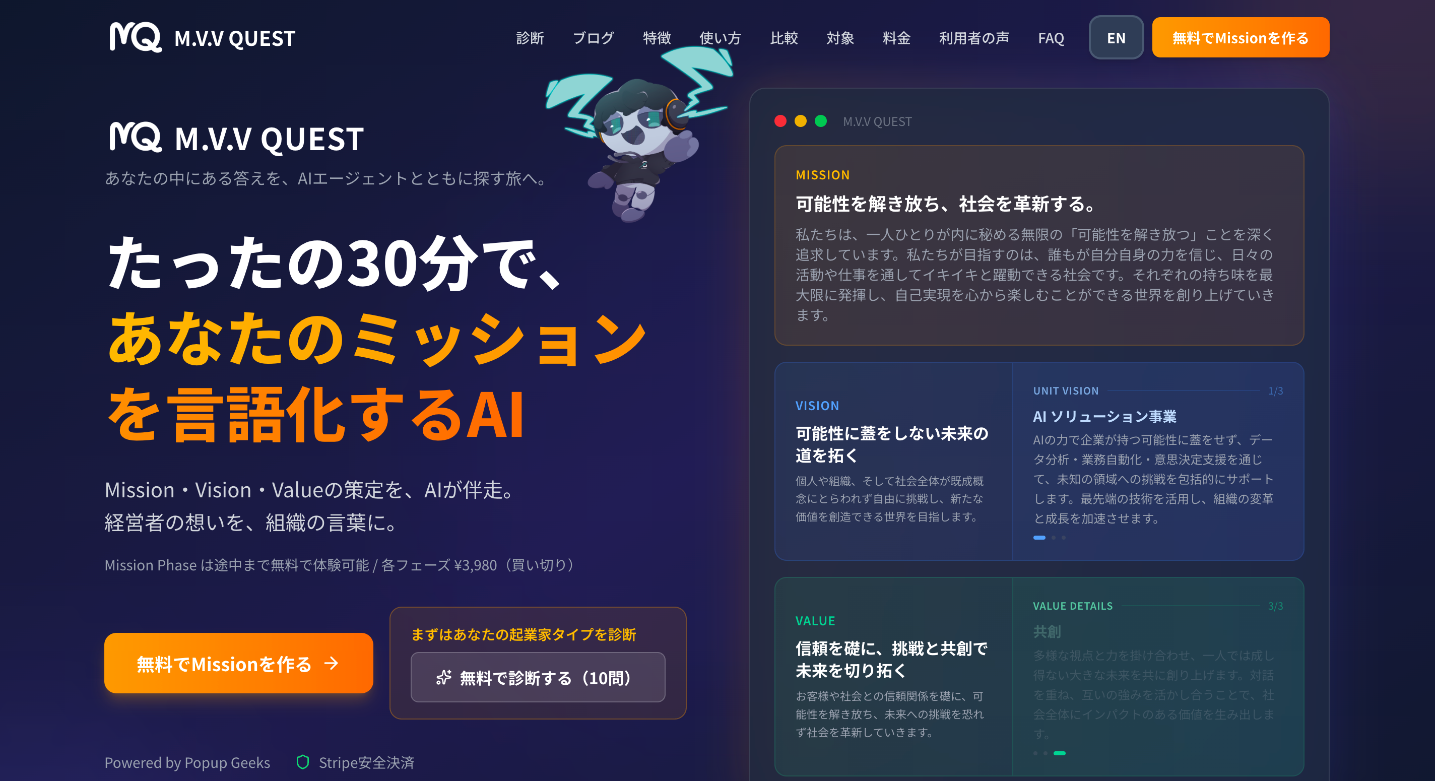 スタートアップポップコーン株式会社(本社:福岡県飯塚市、代表取締役CEO:澤田 聖士)は、AIとの対話を通じて企業のMission(存在意義)・Vision(事業方針)・Value(価値観)を策定できるWebサービス「M.V.V QUEST」( https://mvv.popupgeeks.jp )を2026年2月25日に正式リリースいたしました。Mission策定(5ステップ)は完全無料でご利用いただけます。