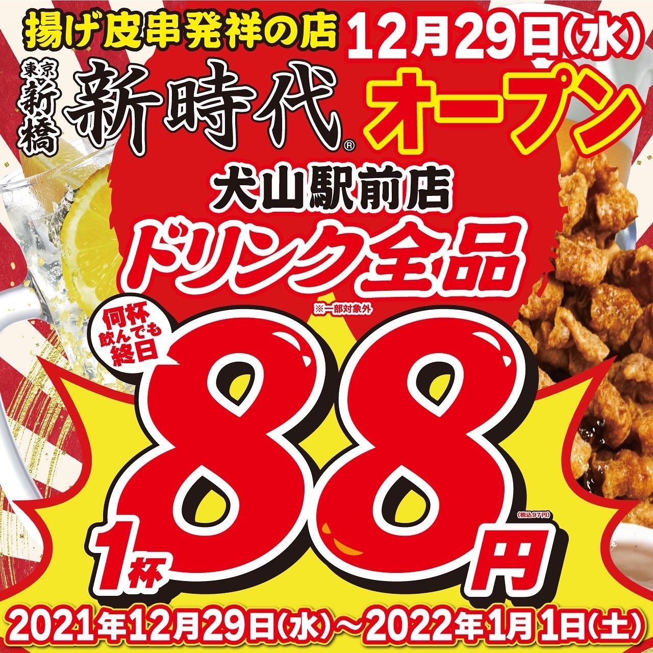 「新時代 犬山駅前店」のオープンを記念し、ドリンク全品を1杯88円(税込97円)でお楽しみいただけるキャンペーンを開催します。一度、『新時代』にご来店頂ければ、新時代がなぜこんなにも人気なのかを分かって頂けると思います。皆様のご来店お待ち申し上げます。