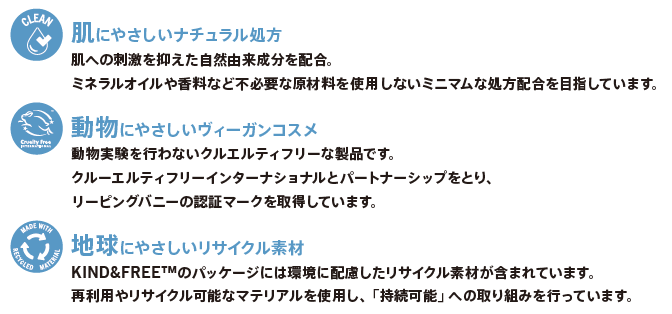 自然由来成分配合で、人・動物・地球に配慮した「カインド&フリー」は、「美しさの多様性や個性を尊重し、ありのままの自分を愛する」という私たちのポリシーに基づいて開発されています。