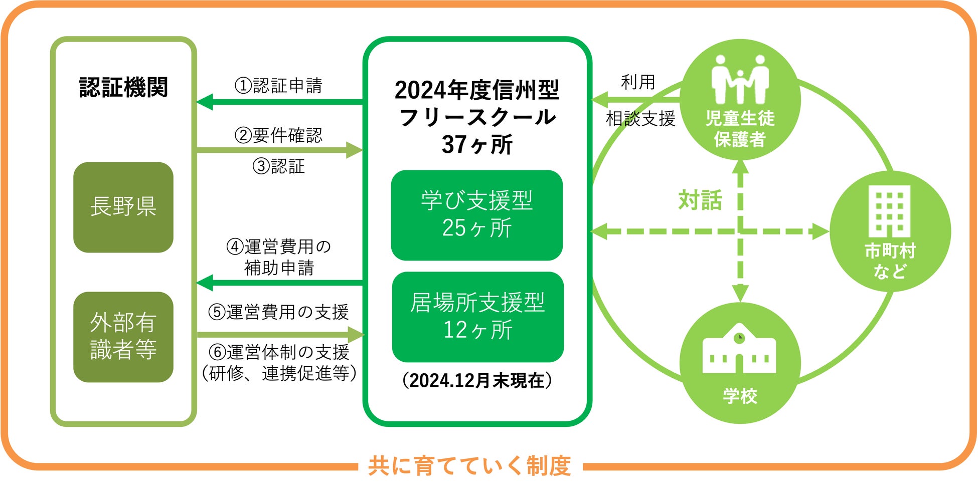 長野県は、2024年度から、増加する不登校児童生徒等の多様な学びの場の確保・充実を図るため、一定の基準を満たす県内のフリースクール等民間施設を認証し、運営経費への補助や体制支援を実施する「信州型フリースクール認証制度」を開始しています。