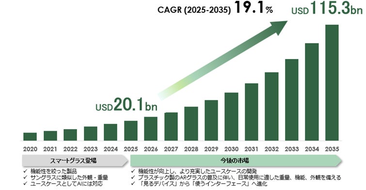 Ray-Ban Meta をはじめとするスマートグラスの普及を契機に、眼鏡型デバイス市場は世界的に普及フェーズが急速に進展し、2026年以降はARグラス市場の本格的な拡大が見込まれています。Future Market Insights社の調査によると、ARグラス市場は2025年から2035年にかけて年平均成長率19.1%で拡大し、2035年には市場規模1,153億米ドルへ拡大するとの予測が示されており、情報取得の主要インターフェースがスマートフォンから眼鏡型デバイスへ移行する転換点にあると考えます。