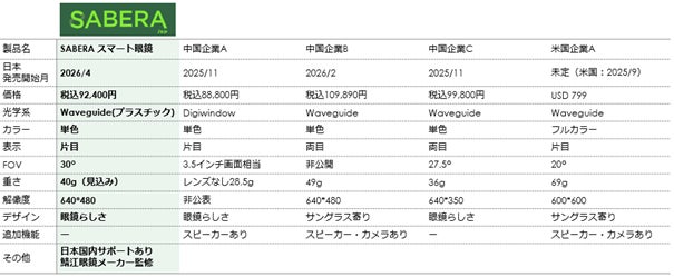 一般消費者向けARグラスは、海外メーカーを中心に製品展開が進んでおります。一方で、国内における同市場は未成熟であり、当社が先行する形で市場参入を行っています。各社製品においては、用途や設計思想に違いが見られる中、SABERAは日常利用を前提とした設計思想のもと、光学技術・装着性・UX設計のバランスを重視したプロダクトとして開発を進めています。