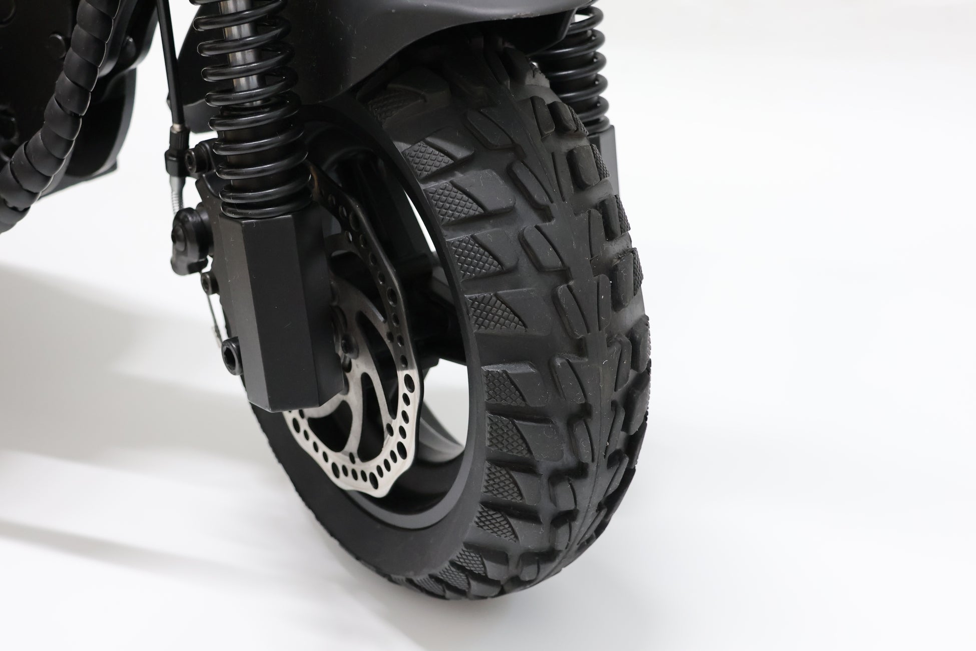 10インチ大径ノーパンクオフロードタイヤ、前後サスペンション、前後ディスクブレーキを標準装備。