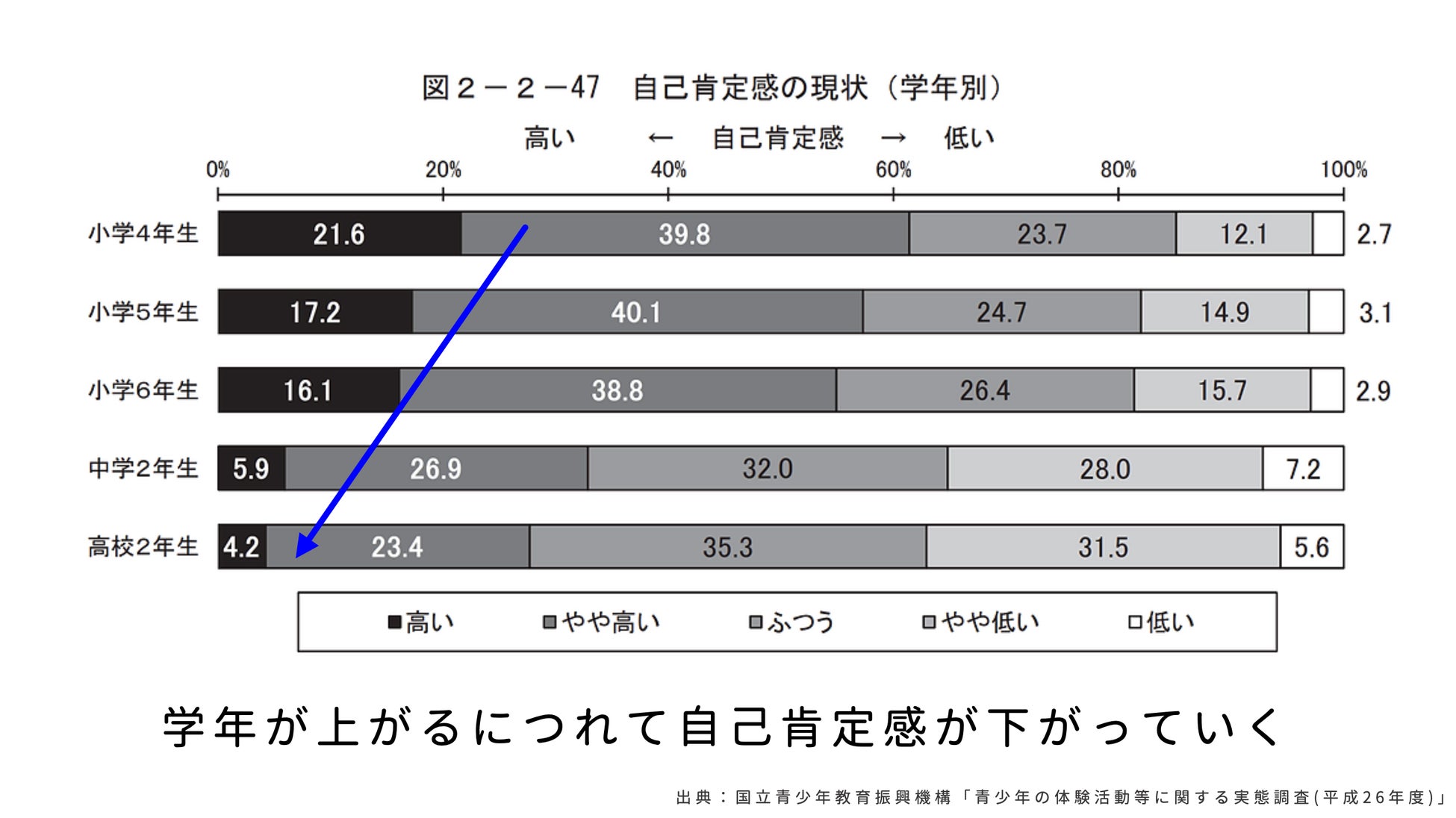 「学年が上がるごとに学んだこと、できるようになったことは増えているはずなのに、子ども達の自己肯定感は学年が上がるごとに下がっていく」との調査結果が国立青少年教育振興機構から出ています。