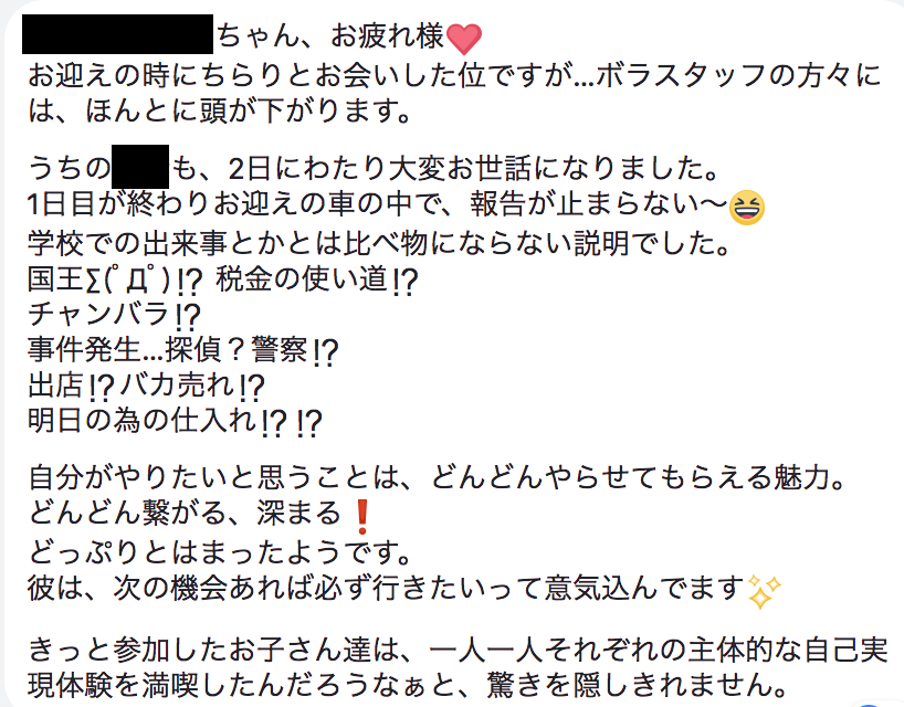 お家の方からは、「うちの娘はおとなしくて引っ込み思案だと思っていたのですが、自分から考えて動いた話を娘から聞いて、親も知らなかった一面を知ることができて驚いた」という声もよくいただきます。