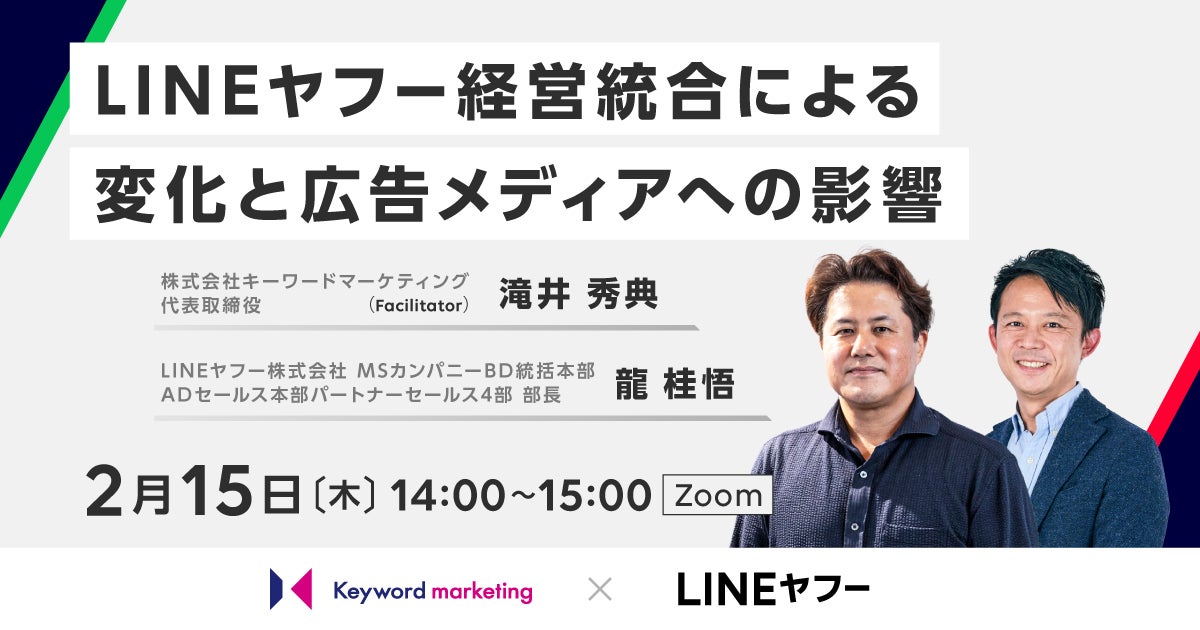 株式会社ベクトル(本社:東京都港区、代表取締役会長兼社長:西江 肇司、東証プライム:6058)の子会社である株式会社キーワードマーケティング(本社:東京都中央区、代表取締役:滝井 秀典)は、LINEヤフー株式会社(本社:東京都千代田区、代表取締役社長 CEO:出澤 剛)と共同で、無料オンラインセミナー『LINEヤフー経営統合による変化と広告メディアへの影響』を2月15日(木)14時より開催いたします。