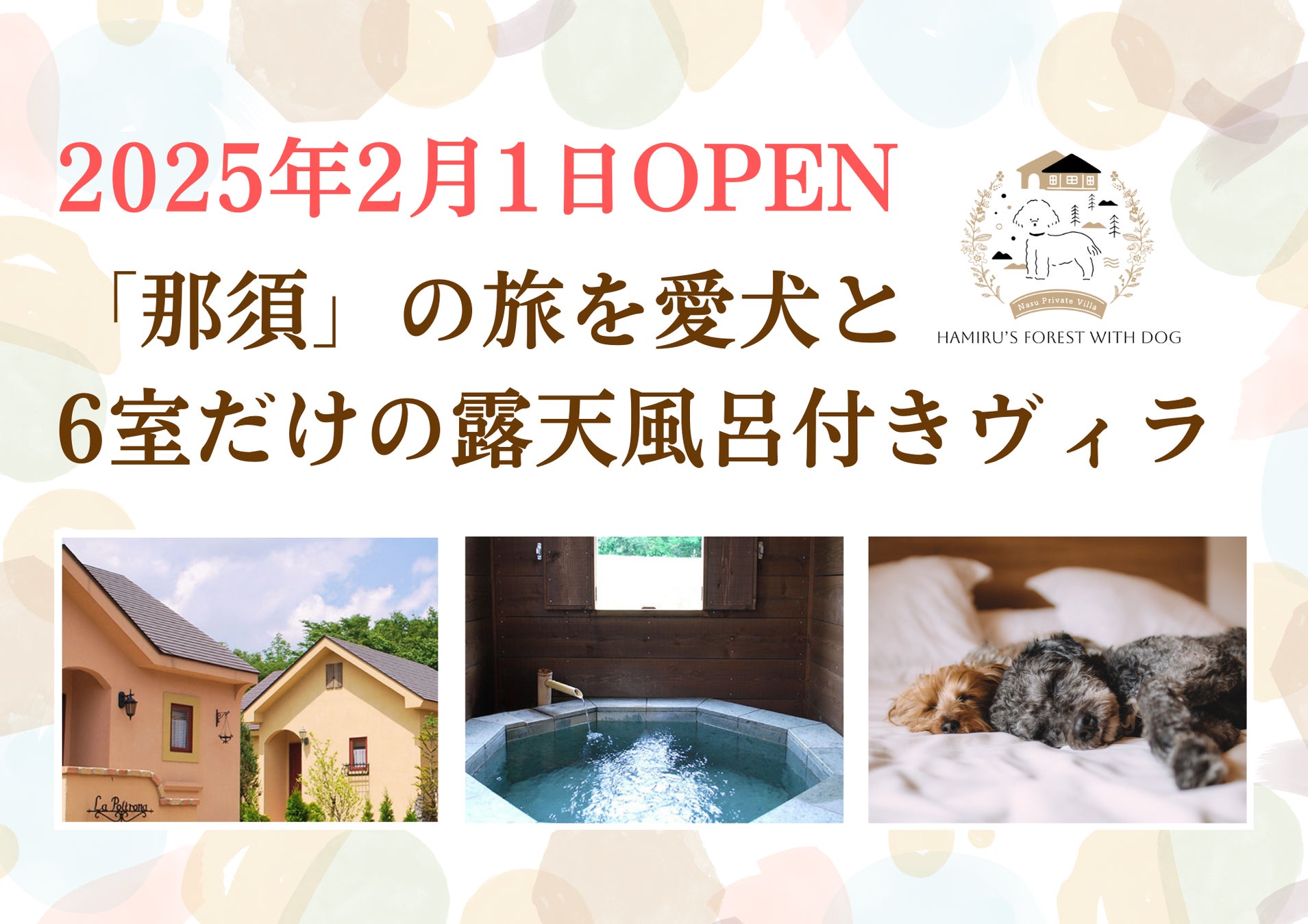 株式会社HAMIRU(所在地:千葉県市川市 代表:熊崎紗弥佳 以下「HAMIRU」)は、栃木県那須町の自然豊かな環境に愛犬と一緒に楽しむことができる全6室の客室露天風呂付きヴィラ「HAMIRU’S FOREST with DOG」(ハミルズフォレスト ウィズ ドッグ)を2025年2月1日にグランドオープンいたします。https://www.hamirus-forest.com/