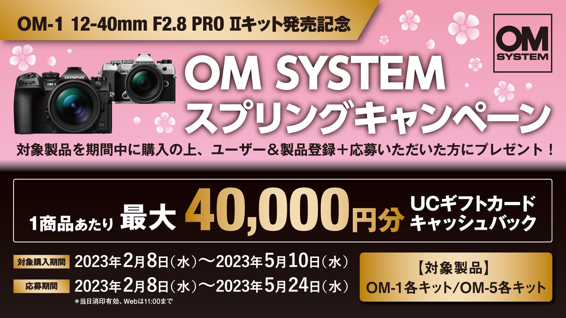 OMデジタルソリューションズ株式会社は、ミラーレス一眼カメラ「OM-1 12-40mm F2.8 PRO IIキット」の発売を記念して、対象製品をお買い上げいただいたお客様を対象とした『OM SYSTEM スプリングキャンペーン』を2023年2月8日(水)より実施します。