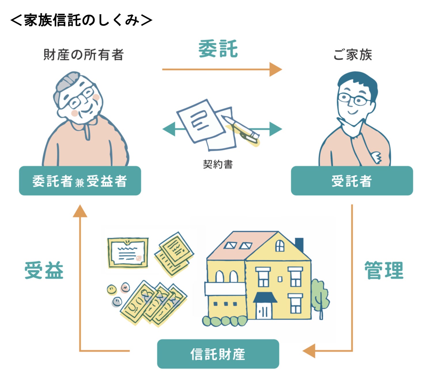 家族信託とは、家族や信頼できる第三者との間で結ぶ、自分の資産の管理を委託する契約のことです。判断能力があるうちに大切な財産を信頼できるご家族に託すことにより、たとえ認知症などにより判断能力が低下した後でも、ご本人の希望やご家族のニーズに沿った、柔軟な財産の管理や運用を実現することを目的とした仕組みです。