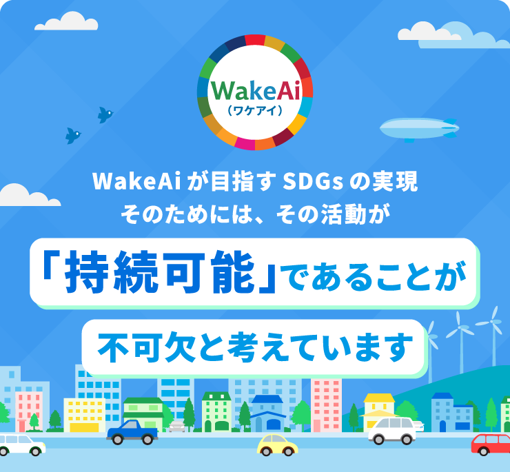 などがございますが、今後もSDGsの実現に向けた具体的な活動として、【WakeAi(ワケアイ)】という企業体が行う事業活動が、日本社会における「経済活動×社会貢献活動」という新しい形のロールモデルとなれますよう、今後もあらゆる可能性を見出してしてまいりたいと思っております。