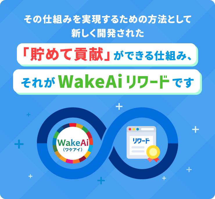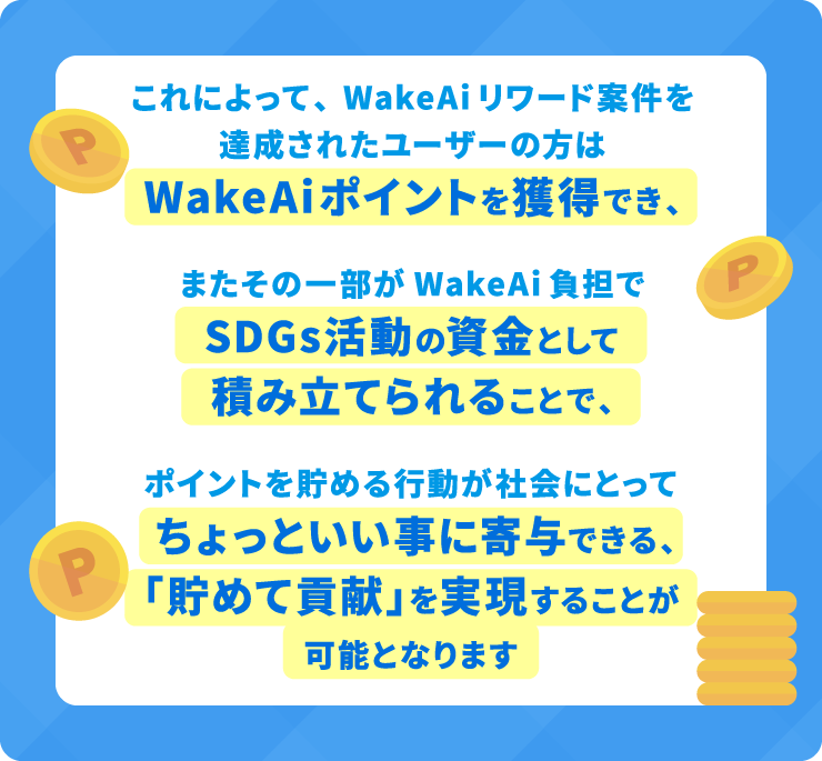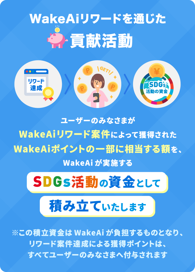 WakeAiリワード案件を達成されたユーザーの方はWakeAiポイントを獲得でき、またその一部がWakeAi負担でSDGs活動の資金として積み立てられることで、ポイントを貯める行動が社会にとってちょっといい事に寄与できる、「貯めて貢献」を実現することが可能となります。