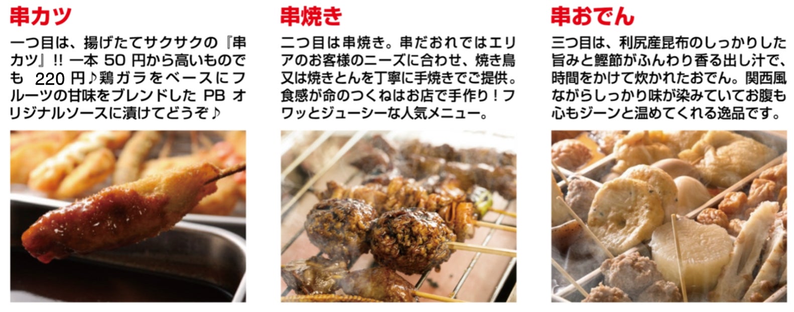 「串」は日本人にとって馴染み深い言葉です。日本人の食文化といえる「串」を取り入れ、「串を学び、串にこだわり、串を広げる」とコンセプトテーマに『大衆串酒場 串だおれ』は生まれました。