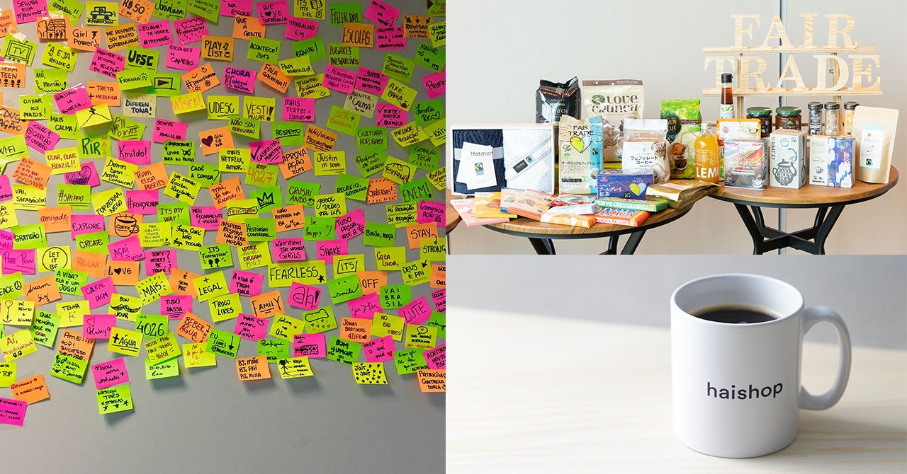 haishop×青山学院大学×フェアトレードラベルジャパンの三者コラボで、付箋アートの展示や社会問題を体感する「2050年コーヒー」等を販売