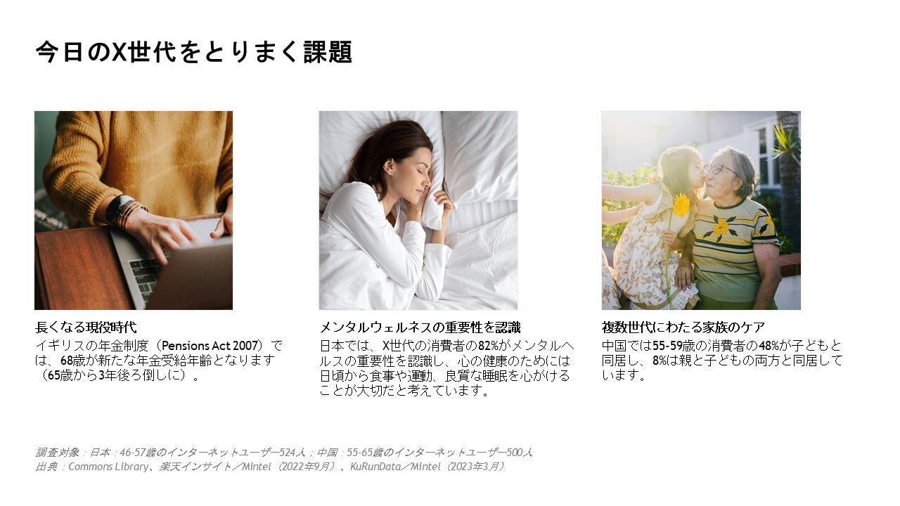 「X世代とは1965年から1980年の間に生まれた世代を指します。Z世代、ミレニアル世代、団塊の世代などに注目が集まる中、X世代はしばしば『忘れられた世代』とも言われますが、彼らは自身の子どもの面倒を見ながら、両親の世話もする、『サンドイッチ世代』と呼ばれる状況にあります。X世代の抱える課題をサポートし、彼らの健康寿命を伸ばすような製品開発が、日本でさらに行われても良いのではないでしょうか。」