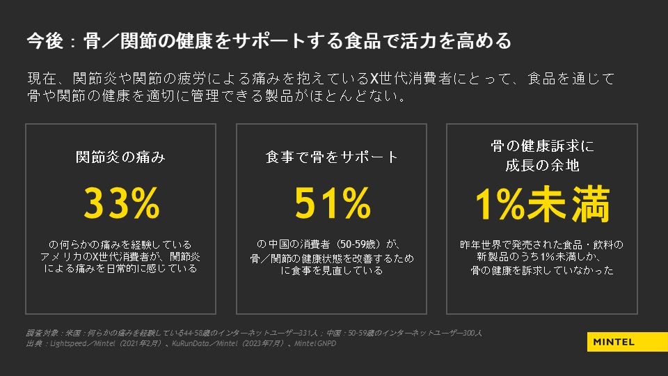 「こういった状況におかれているX世代に向けて、食品・飲料ブランドは栄養価の高い製品を通じて、中年期の消費者の健康維持をサポートすることができます。また、ミンテルが行った消費者調査によると、中国の50歳~59歳の消費者の51%が、『骨/関節の健康状態を改善するために食事を見直している』と回答している一方で、ミンテル世界新商品データベース(GNPD)のデータによると、昨年世界で発売された食品・飲料の新製品のうち、1%未満しか、骨の健康を訴求していなかったということが分かりました。骨の健康訴求に成長の余地があると言えるでしょう。」