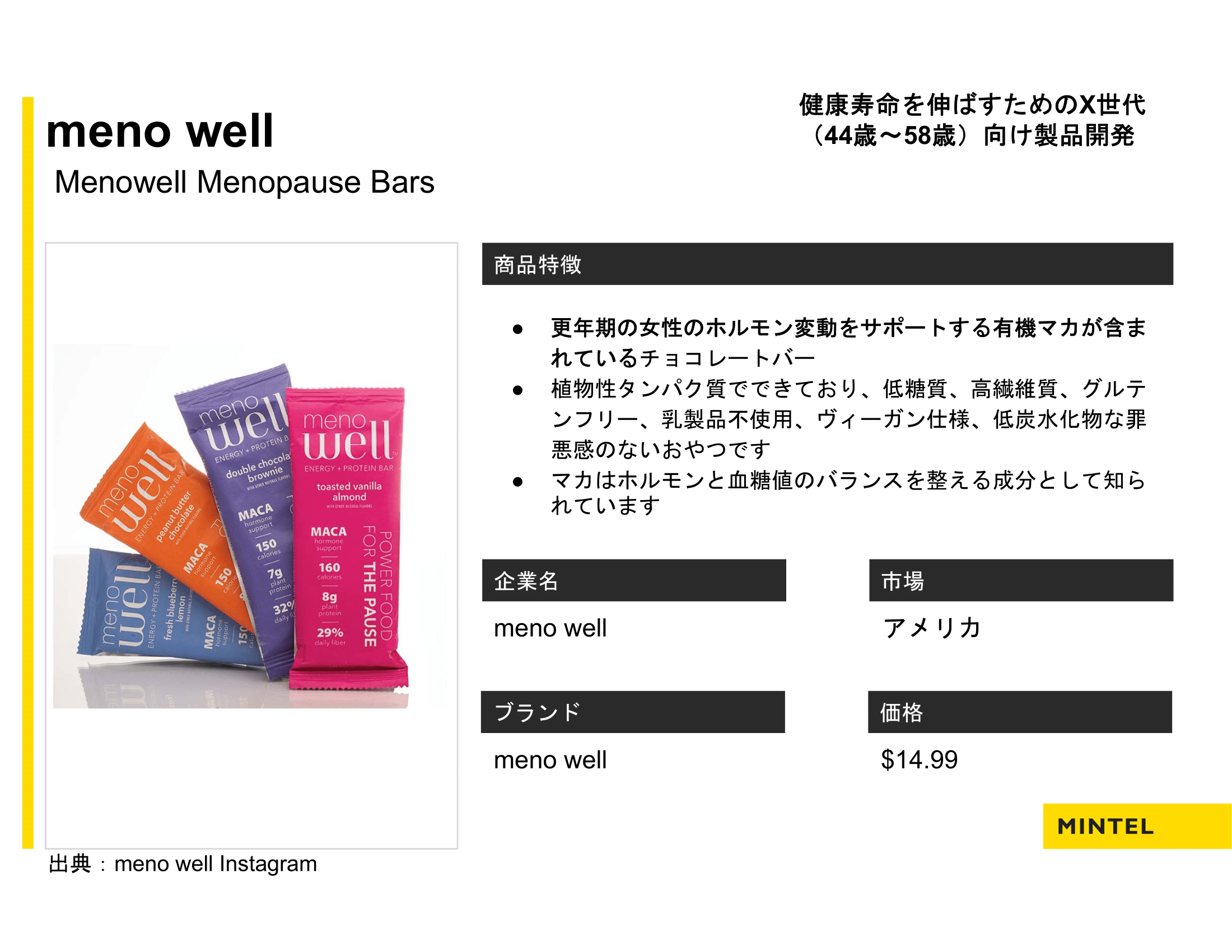 さらに将来的にはホルモンの健康に注目し、食品・飲料イノベーションのヒントにすることができる、として更年期の女性向けにホルモン変動のサポートをする有機マカが含まれているチョコレートバー「meno well - Menopause Bars(アメリカ)*1」など海外の製品例を挙げました。
