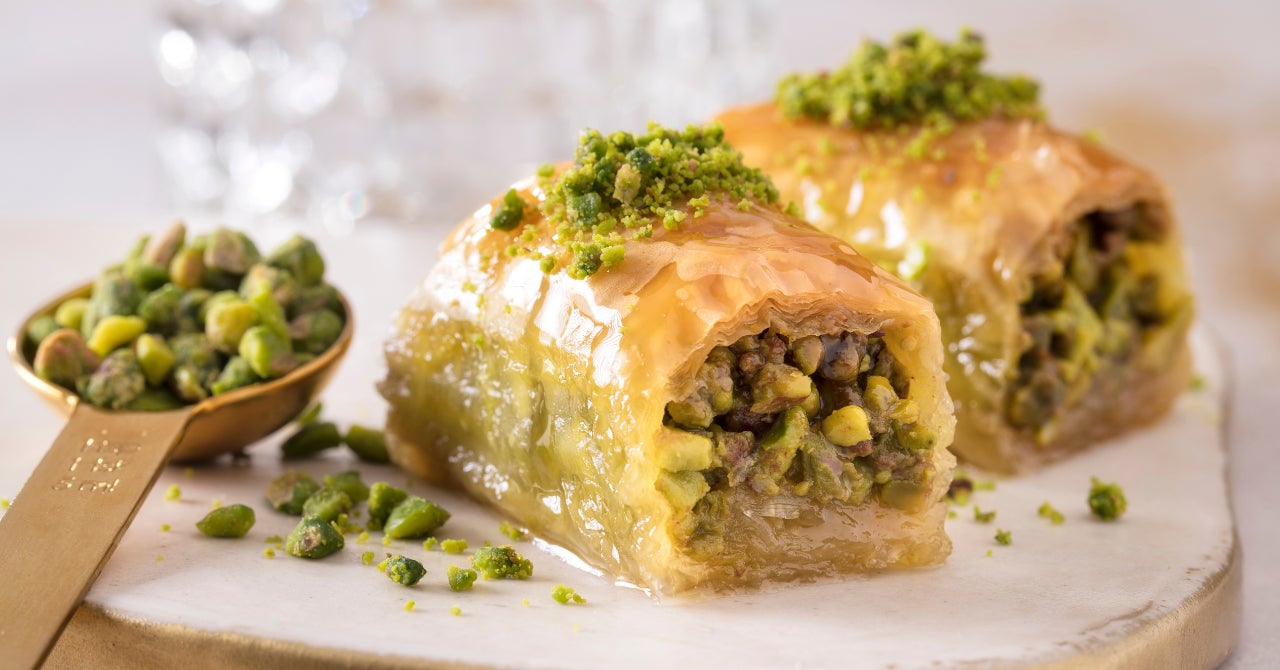 薄いパイ生地を手作業で幾層にも重ね、砕いたピスタチオやくるみをたっぷり挟み焼き上げ、甘いシロップをかけて仕上げたトルコの伝統菓子。