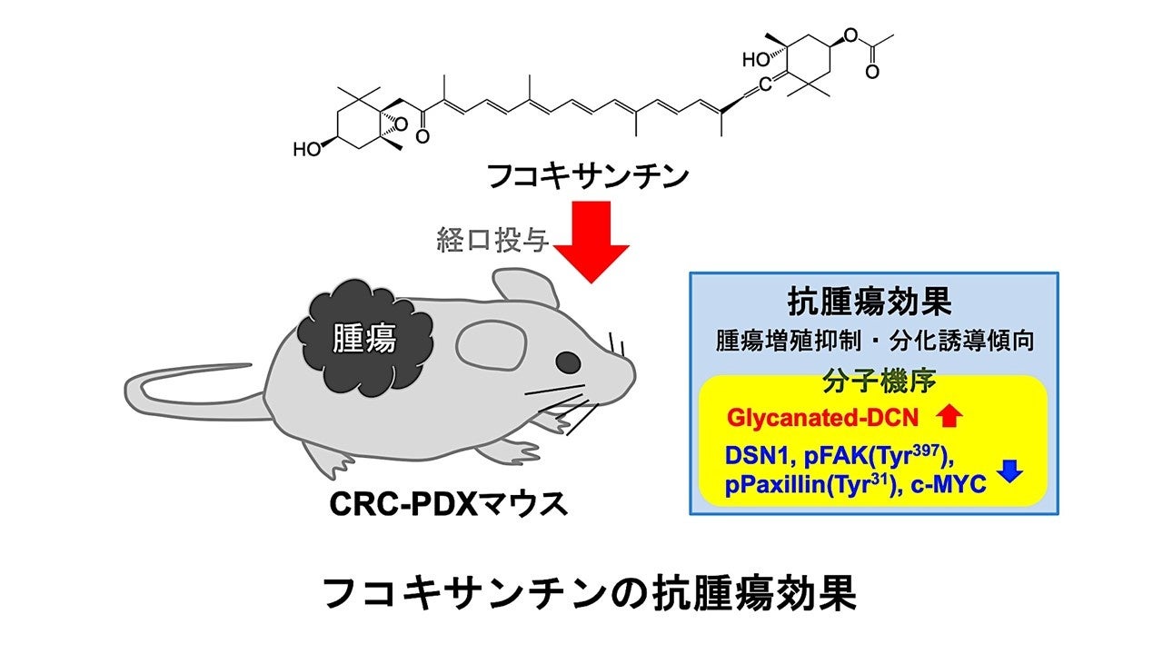 フコキサンチン(Fx)は、様々な大腸がん(CRC)動物モデルにおいて強力な抗がん作用を示す。しかし、ヒトのがん組織におけるFxの治療効果は不明である。患者由来のがん組織を移植した患者由来異種移植(PDX)マウスモデルは、薬剤候補の抗がん作用を評価するための最良の前臨床モデルとして広く受け入れられている。本研究では、S状結腸がん患者由来のがん組織を移植したPDXマウス(CRC-PDX)を用いて、プロテオーム解析によりFxの抗がん作用を検討した。その結果、 CRC-PDXマウスにFxを投与すると、腫瘍の増殖が有意に抑制され(コントール群の腫瘍に対して0.6倍)、分化誘導傾向が見られた。また、Fxの投与は、CRC-PDXマウスの腫瘍組織において、glycanated-DCNの発現を上昇させ、DSN1、pFAK(Tyr397)、pPaxillin(Tyr31)、c-MYCの発現を低下させた。これらのタンパク質の変化は、フコキサンチノール(Fxの生体内主要代謝物)を添加しアポトーシスを誘導したヒトCRC細胞におけるタンパク質変化と一致した。それ故、Fxの投与により、Fxの代謝物がPDXマウスの腫瘍組織に直接作用して、腫瘍増殖抑制を引き起こした可能性が考えられた。