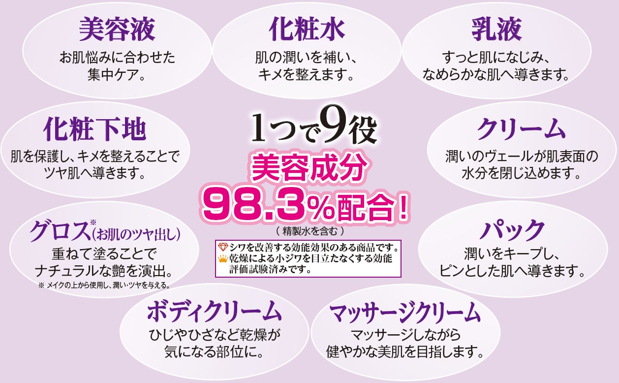 美容液、化粧水、乳液、クリーム、パック、化粧下地、グロス(お肌のツヤ出し)、マッサージクリーム、ボディクリームの9役をこなす、美容液クリームです。